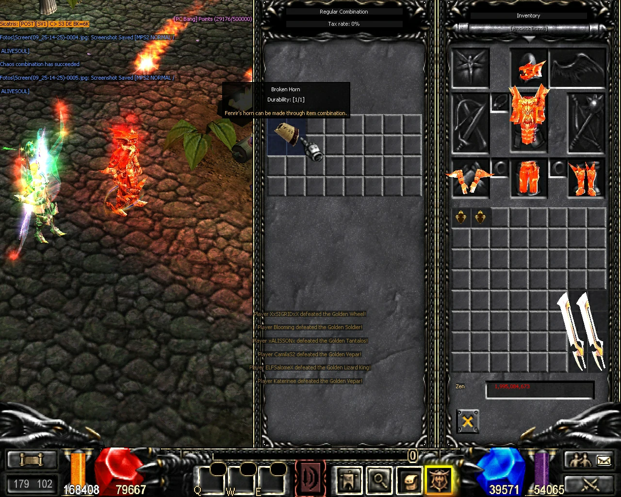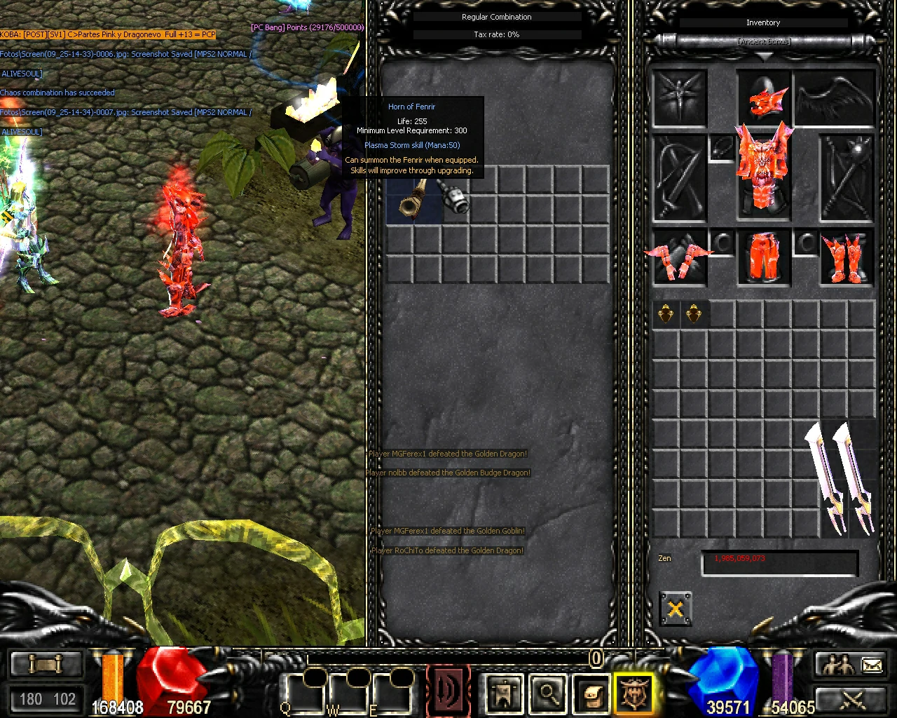 Hablamos con el npc "chaos goblin". Elegimos la primer opción "Combinación regular" e insertamos los items para crear fenrir Splinter of Armor x 20, Bless of Guardian x 20, 1 Jewels of Chaos.